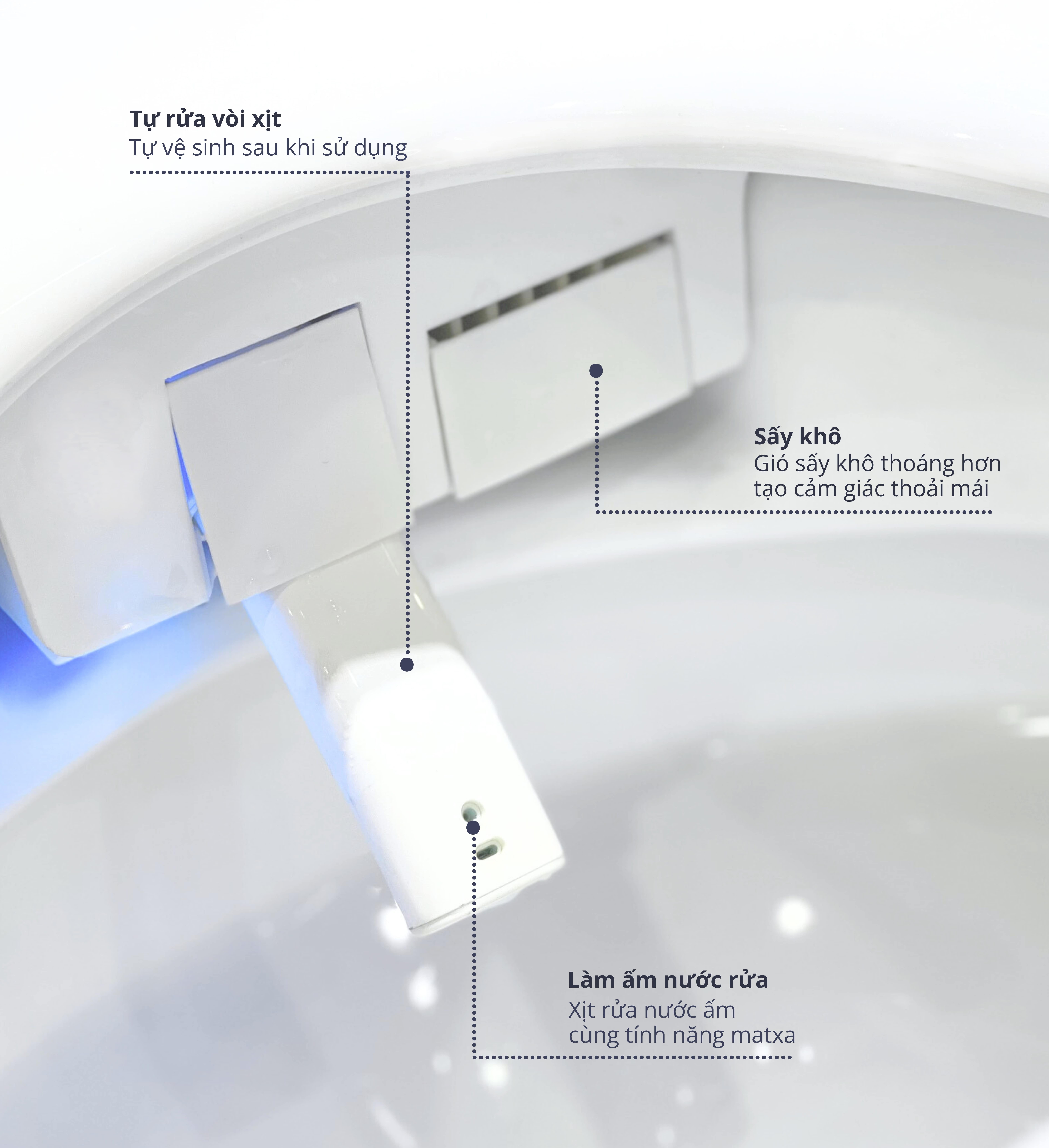 - Hệ thống cảm biến tích hợp vào nắp ngồi giúp nhận biết khi có người sử dụng để kích hoạt chức năng Tự động xả nước, sấy khô.( điều chỉnh nhiệt độ gió sấy)