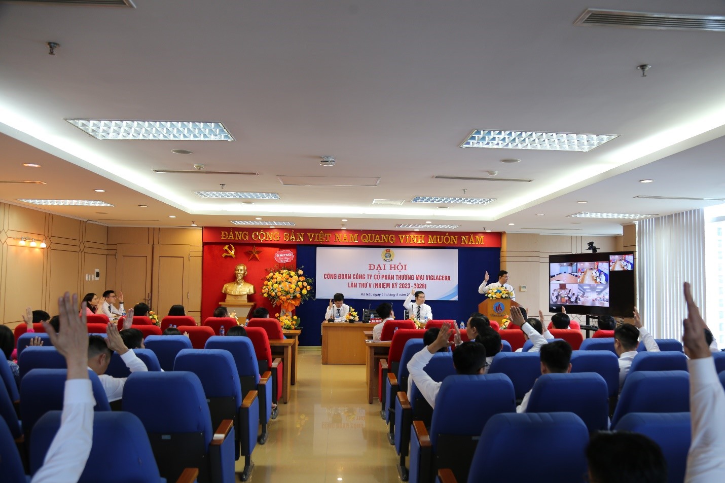 Sau 01 buổi sáng làm việc khẩn trương, sôi nổi với tinh thần đoàn kết, dân chủ, với ý thức trách nhiệm cao. Đại hội đại biểu Công đoàn Công ty CP Thương mại Viglacera Khóa V - Nhiệm kỳ 2023 – 2028 đã hoàn thành nội dung, chương trình đề ra và thành công tốt đẹp.